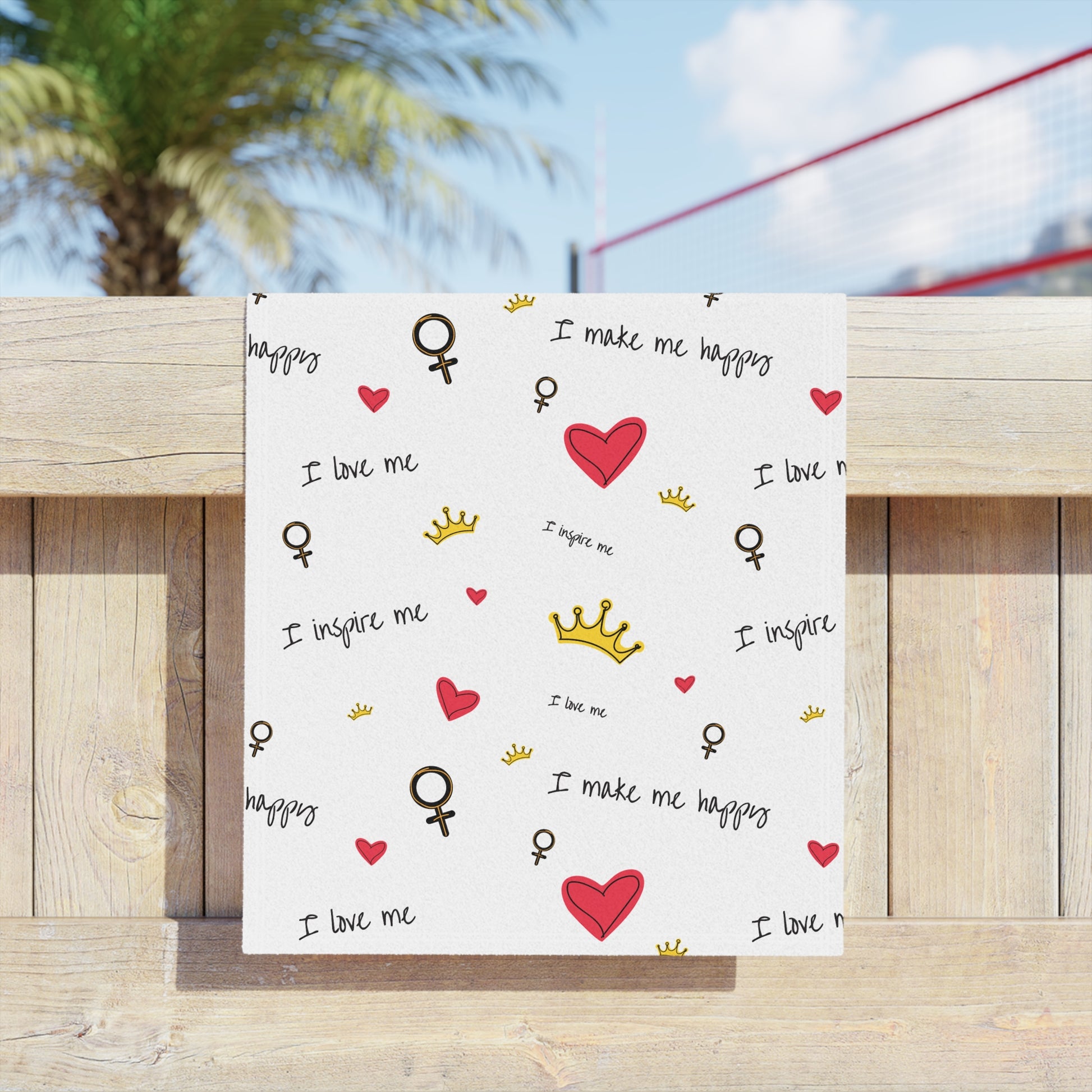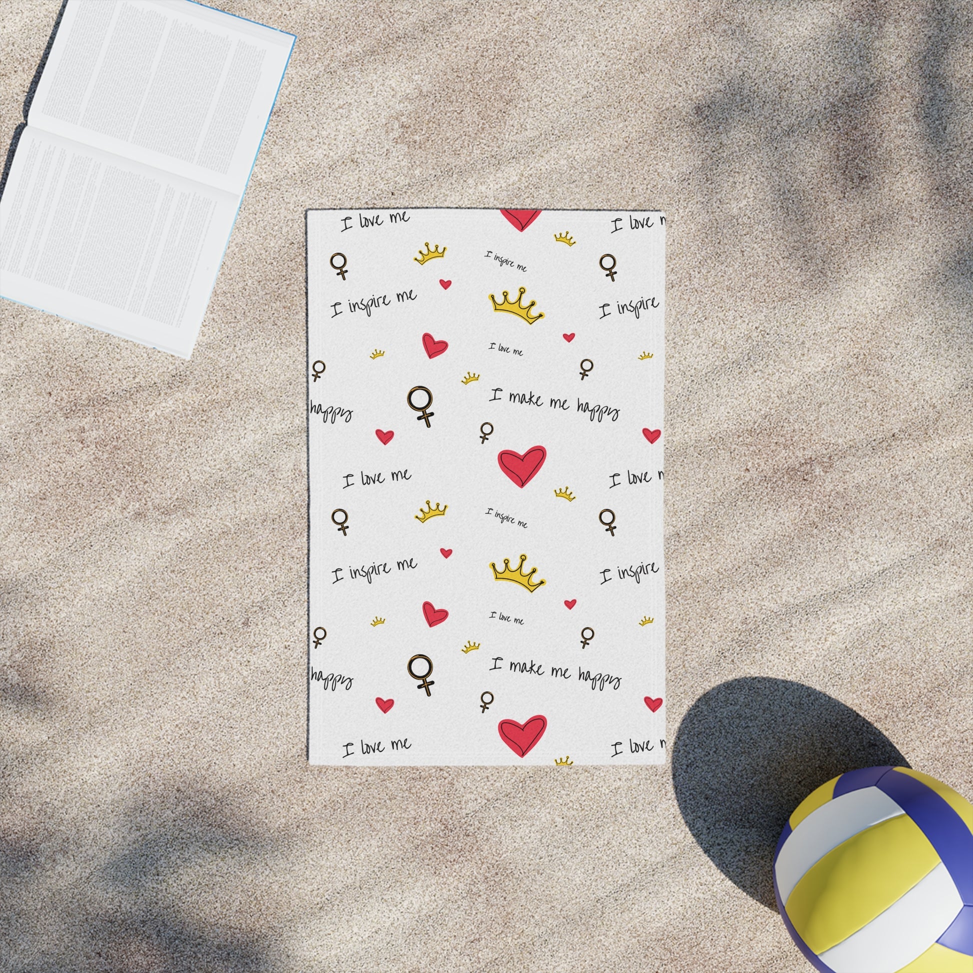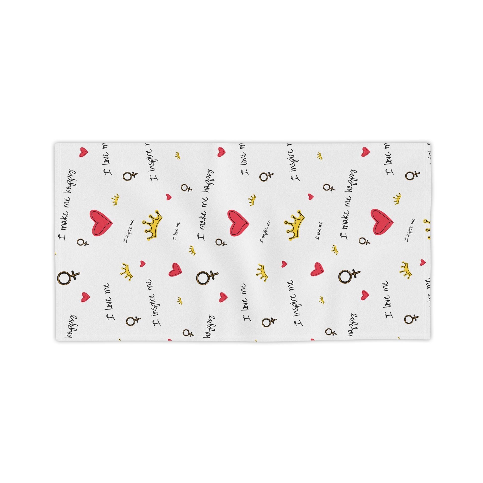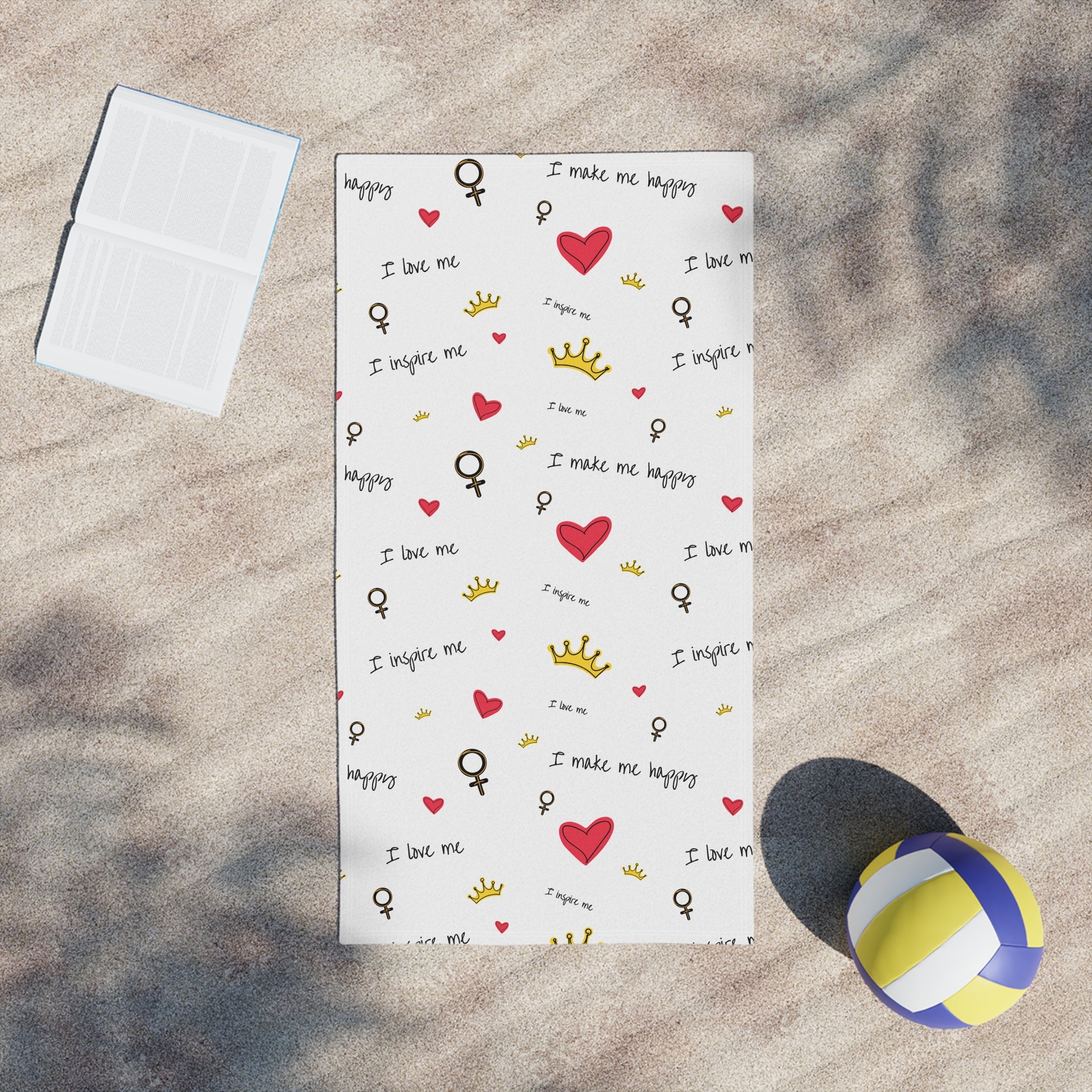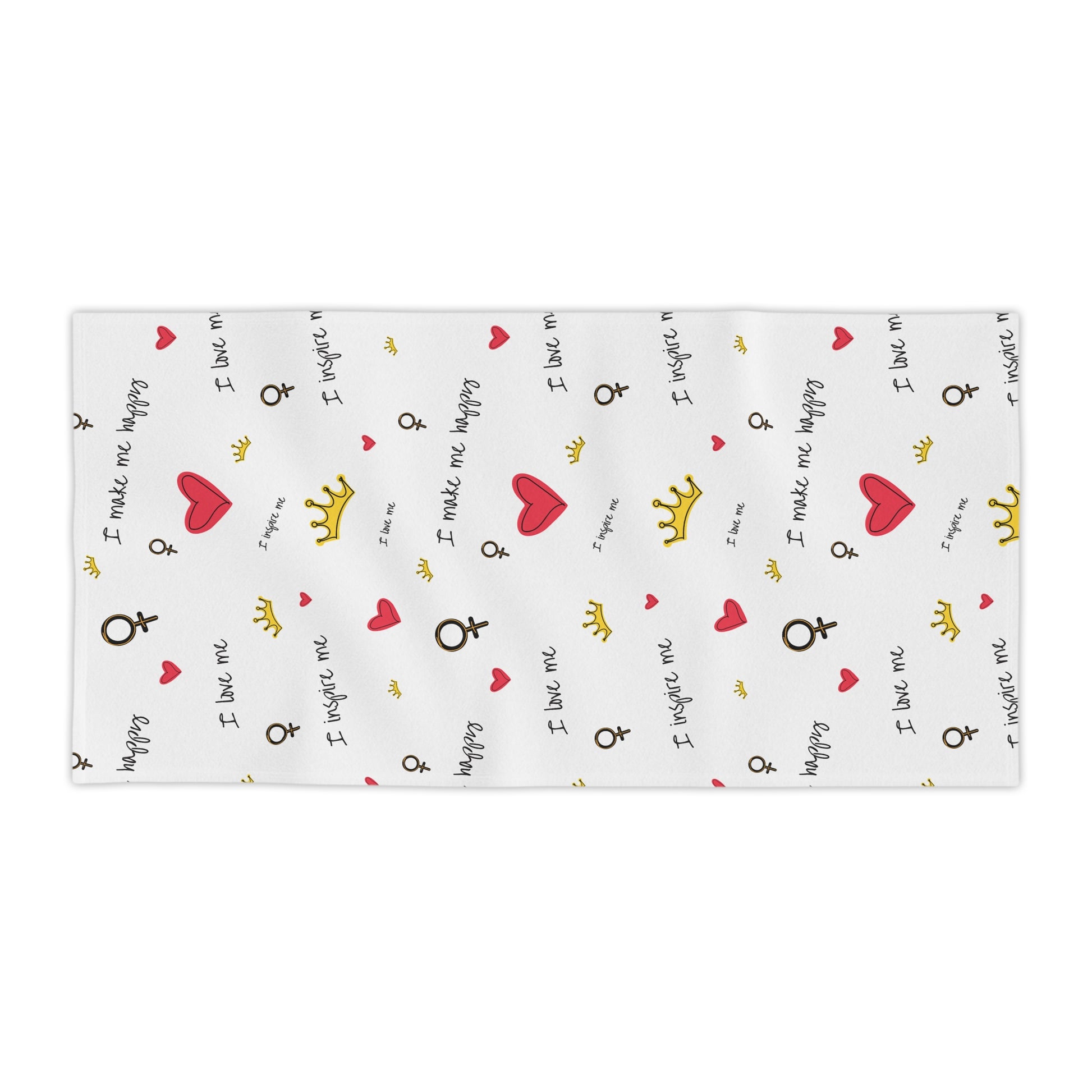Lightweight, cheerful beach towels designed to bring a playful, confident energy to sunny days and self-care moments. The front showcases edge-to-edge, vibrant prints of hand-drawn hearts, tiny crowns, and empowering script—little reminders like "I love me" and "I inspire me" scattered across a clean white field. The soft polyester front holds crisp color while the cotton back keeps the towel absorbent and gentle on skin. Thin and quick-drying, it folds small for tote bags and backpacks, so it travels easily to the shore, the pool, or a weekend retreat. Lay it out, wrap up, or use it as a picnic mat — it adds a bright, personal touch wherever you go.