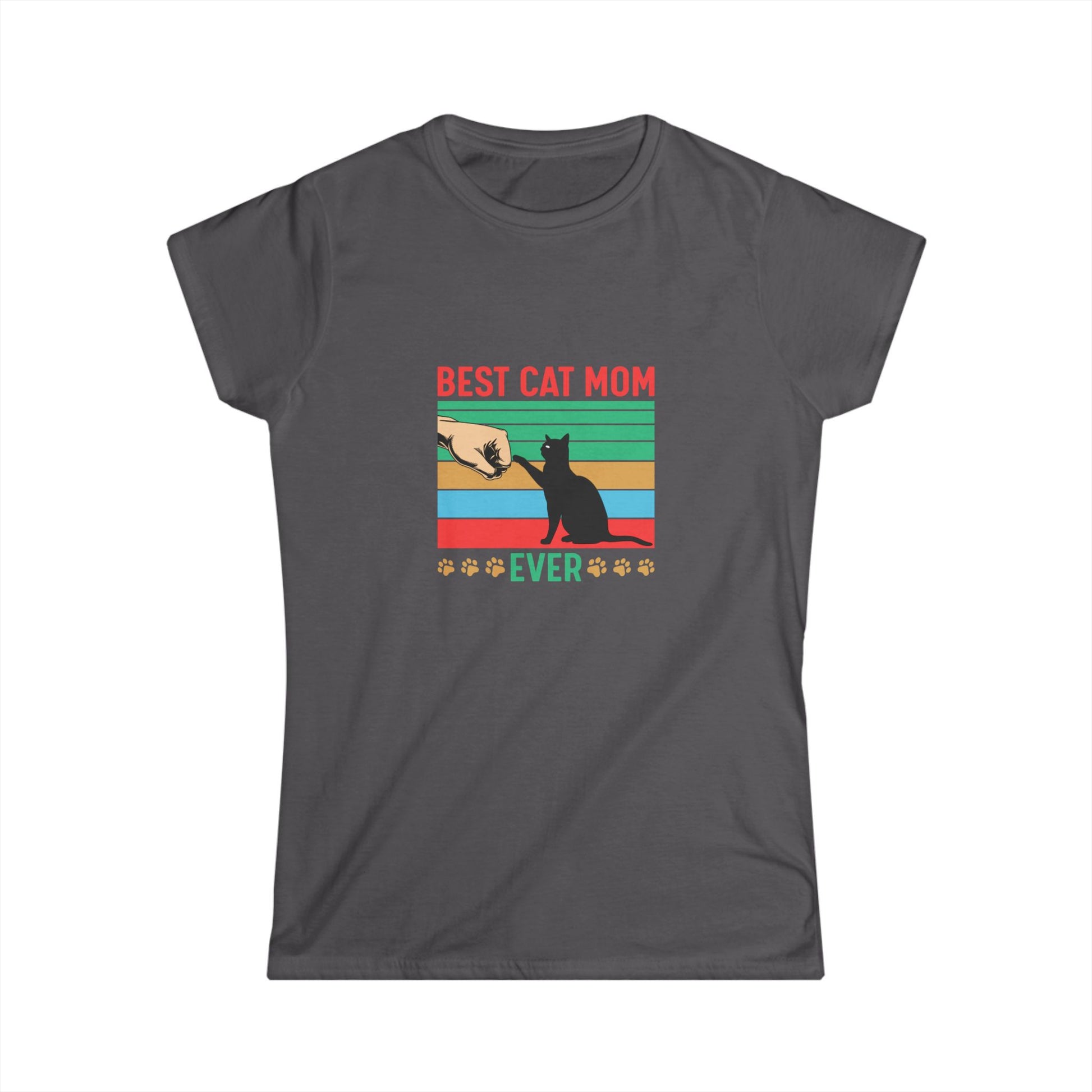 Soft, lightweight tee crafted for cat lovers who show affection in quiet, everyday ways. The front print — a playful silhouette of a cat reaching up beneath retro-striped bands and the words “BEST CAT MOM EVER” — reads like a warm, personal note. Short, semi-fitted cut and whisper-light fabric make it a go-to for lounging with a purring companion, running errands between vet visits, or layering under a cardigan for a cozy morning at the café. The tear-away label keeps the neckline comfortable, while durable double-stitched hems and shoulder tape mean this shirt will hold its shape through many washes and cuddles. Subtle, nostalgic colors give the design a lived-in feel that resonates with longtime cat parents and anyone who delights in the small rituals of cat care.