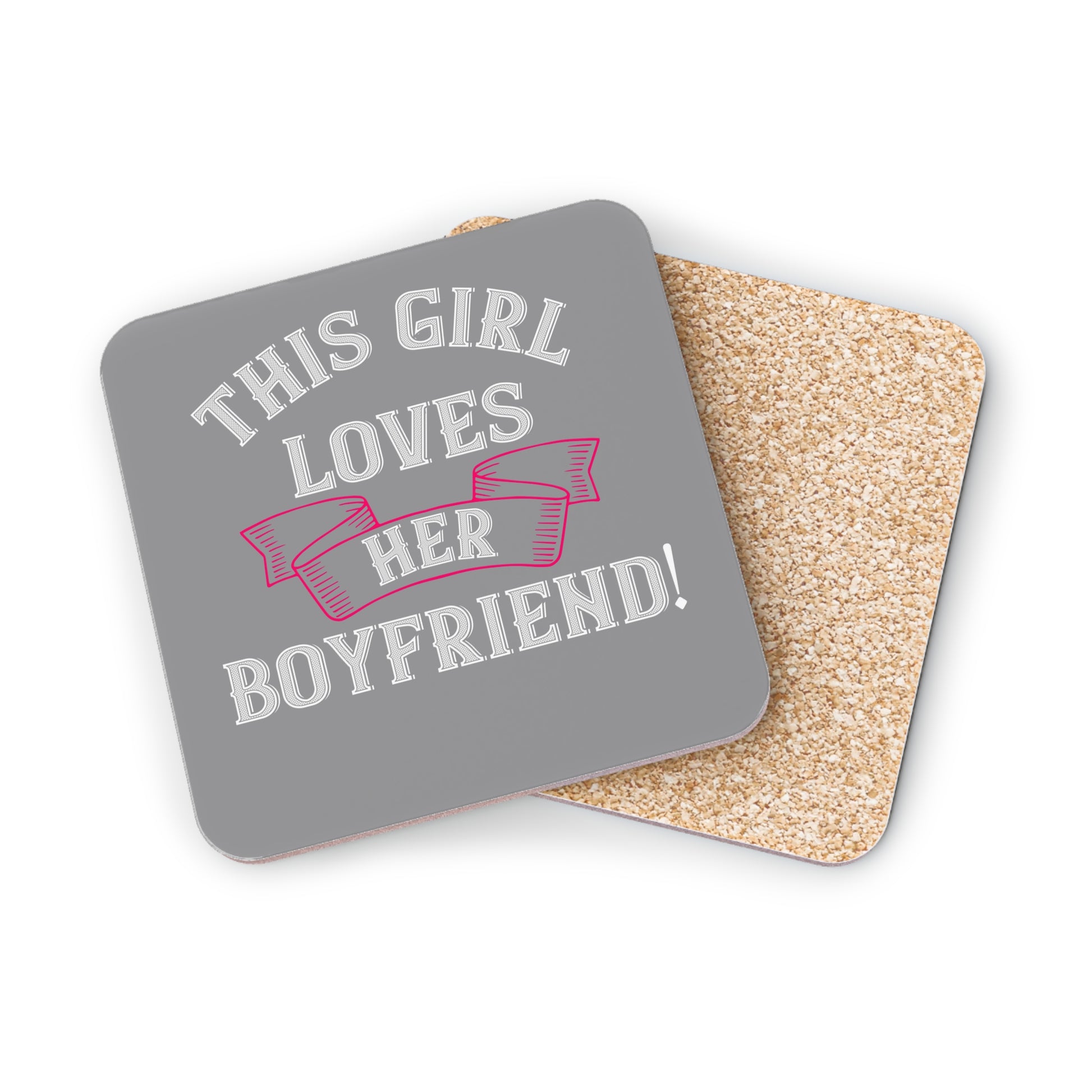 A set of glossy, vibrant coasters that bring playful, personal charm to everyday tabletops. These sturdy hardboard coasters feature bright, crisp printing and a smooth glossy face that showcases the cheeky “This Girl Loves Her Boyfriend!” design against a soft gray background with a pink ribbon accent. The natural cork backing protects surfaces and keeps each coaster from sliding, while the compact 3.7" size fits cups, mugs, and small carafes. Choose round or rectangular shapes, and buy a single piece or a coordinated set of four to add a little personality to coffee breaks, date-night snacks, or cozy living-room moments.