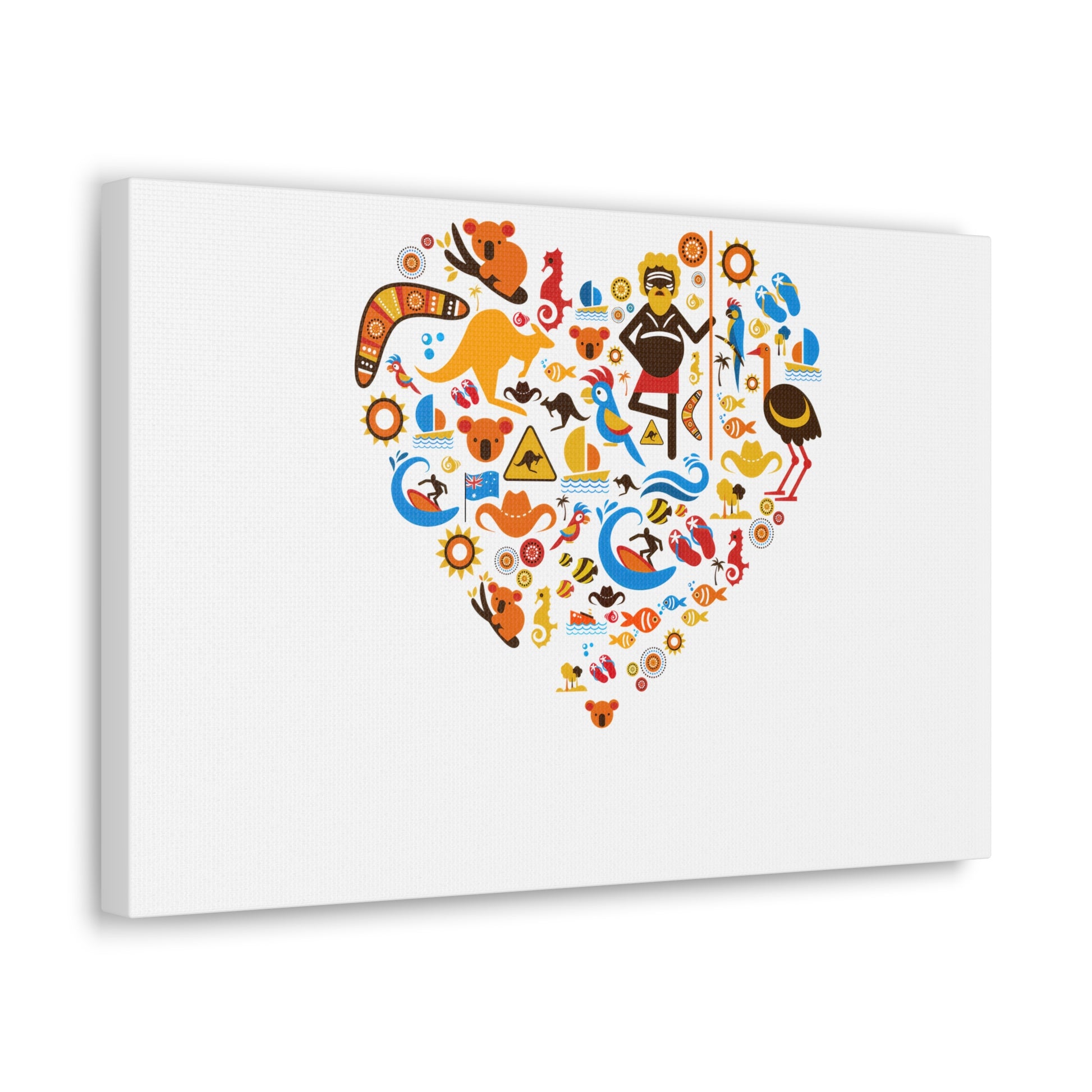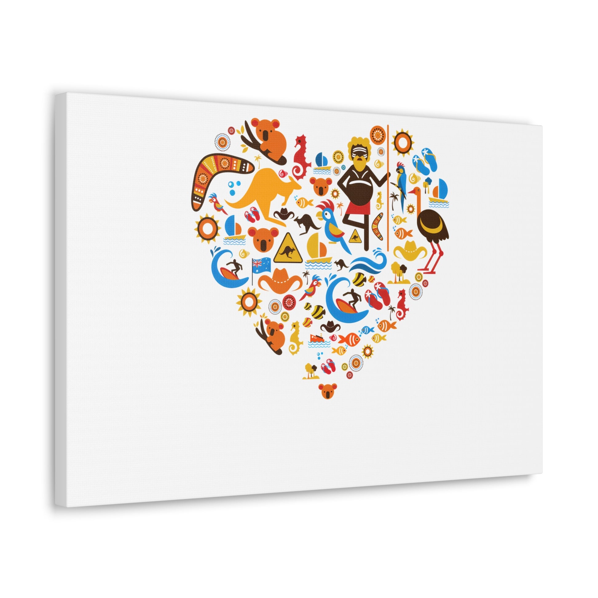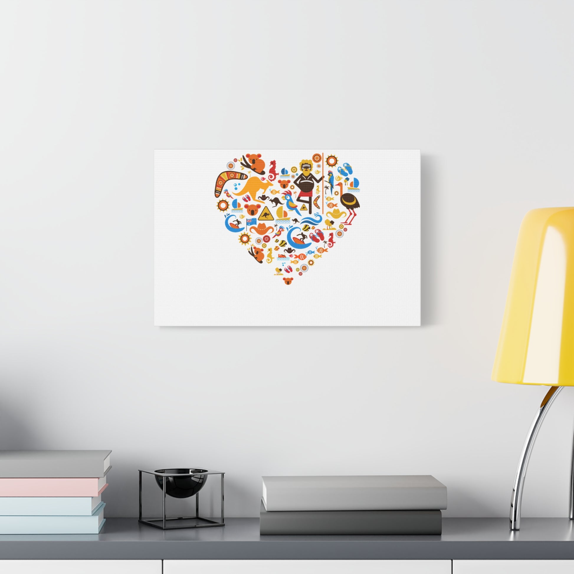 This canvas brings warmth and personality to a room with a playful heart-shaped collage of icons and bright, sunny colors. Printed on semi-gloss polycotton, the artwork sits slightly raised on a New Zealand pine frame so it reads like a window into a joyful, story-rich scene. The satin finish catches light softly, making the reds, blues and golds pop without glare. It arrives with a self-assembly hanging kit so you can mount it quickly and adjust the orientation to fit your wall — horizontal, vertical or square. Choose from 17 sizes to find the scale that suits your space, whether you want a small accent over a desk or a bold focal piece above a sofa. The overall vibe is cheerful and handcrafted, great for homes that favor color, curiosity, and a touch of whimsy.