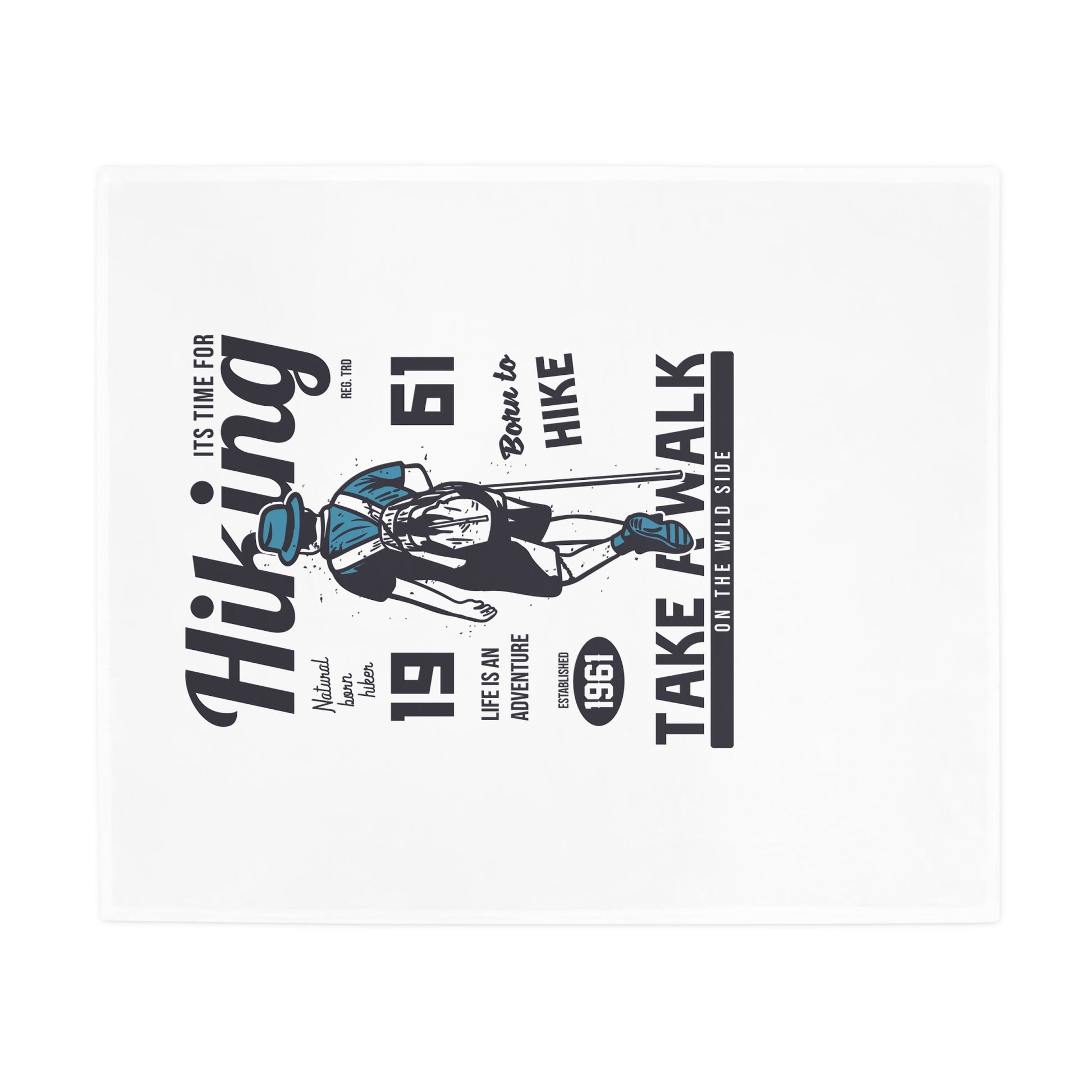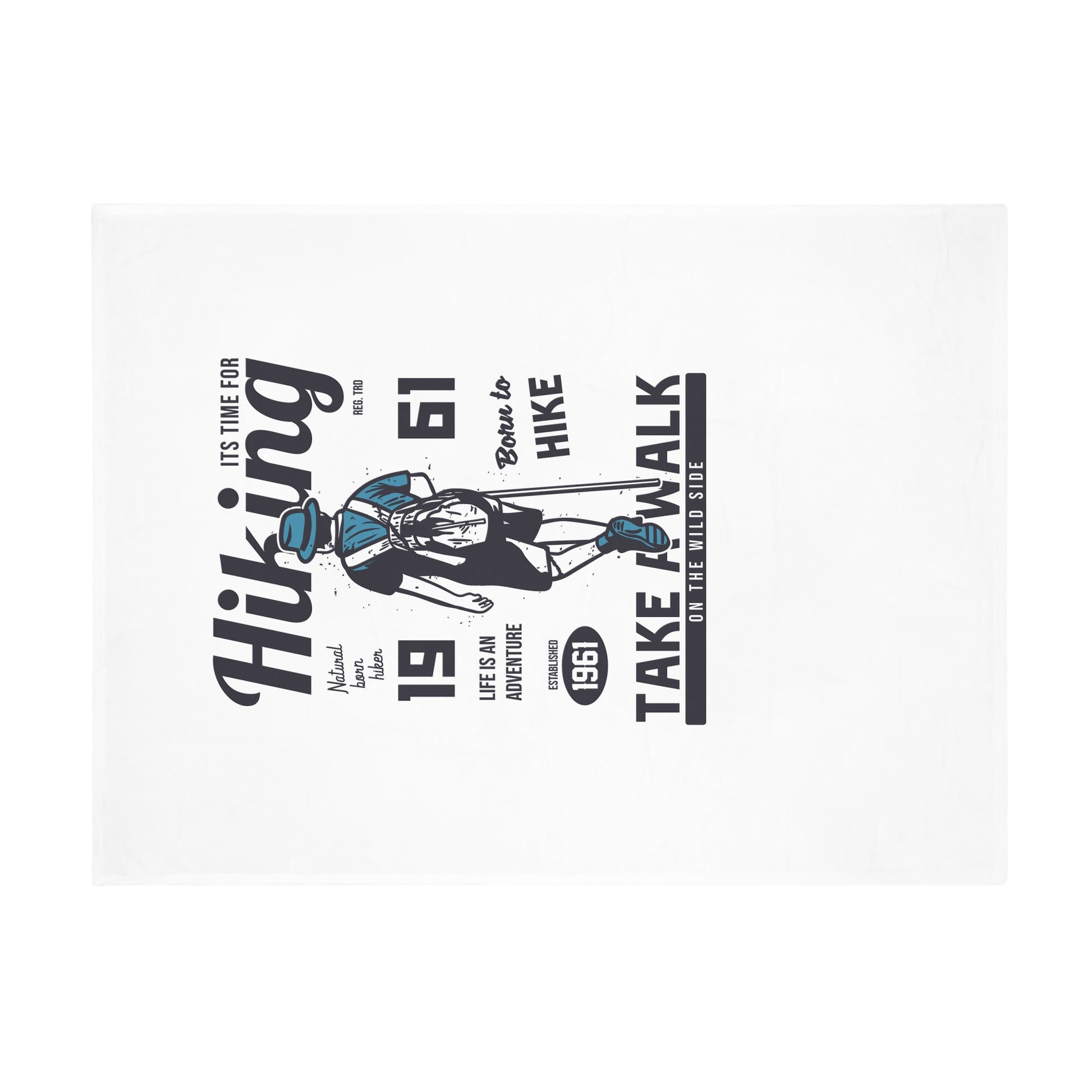 Wrap yourself in a soft, lightweight throw that feels like a quiet trail at dusk. This plush fleece blanket carries a clean, vintage-inspired hiking illustration — a lone backpacker striding forward beneath bold lettering that nods to adventure and the open wild. The white background and crisp, vibrant print keep the design fresh and easy to pair with a cabin couch, camper van, or urban studio. Use it for cool mornings on the porch, layering in the tent, or as a comforting companion during route planning and map-folding sessions. It’s made to move with you: easy to fold, quick to dry, and built to keep its color and edges after many outings and washes.