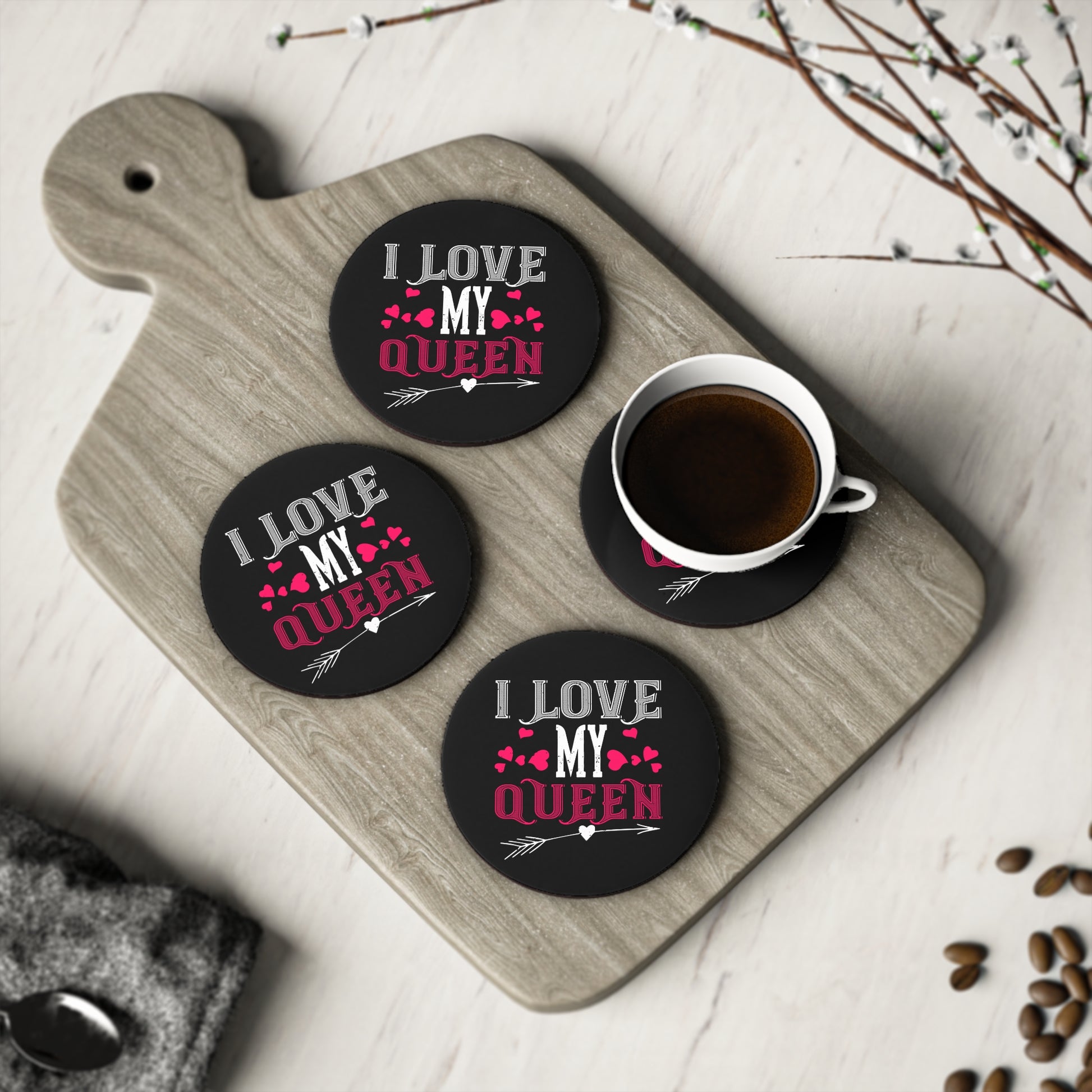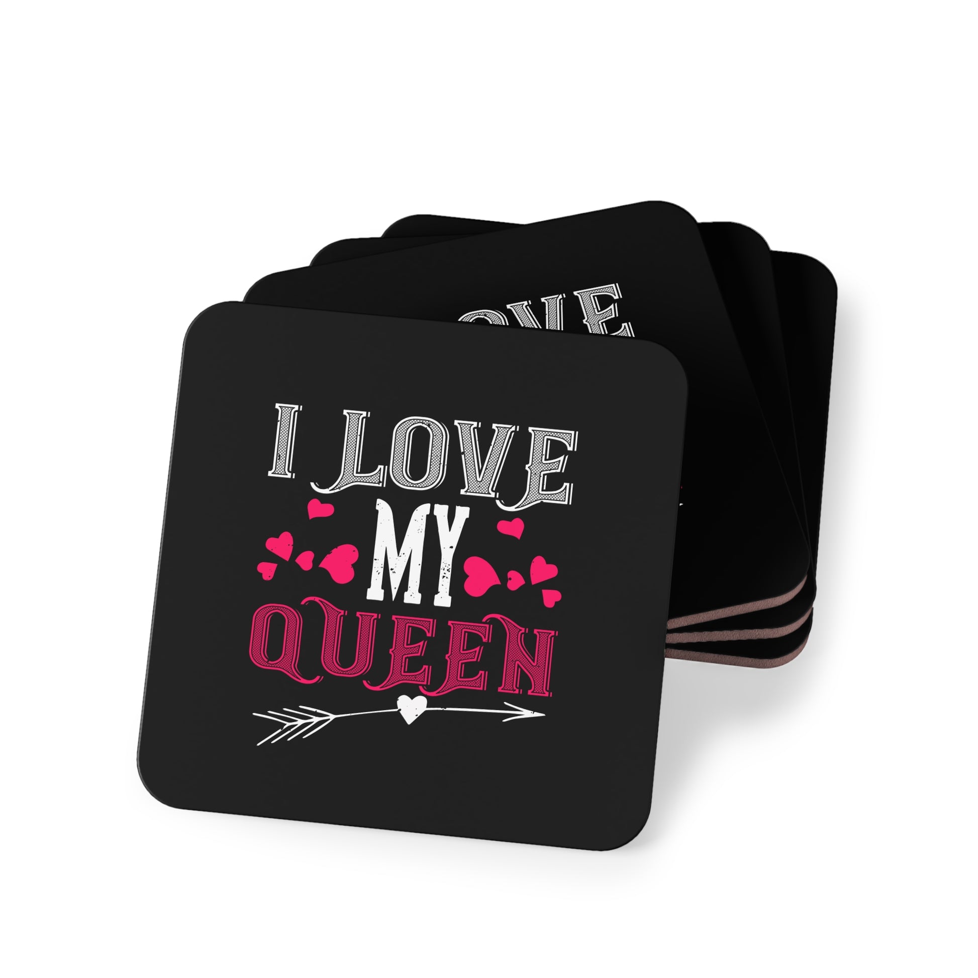 A small, glossy coaster that brings a playful, affectionate message to your coffee table. The bold black background makes the pink and white lettering pop — “I LOVE MY QUEEN” with tiny hearts and an arrow adds a cheeky, romantic touch. Lightweight yet sturdy, the hardboard top has a smooth, high-shine finish that stands up to everyday use, while the corkwood backing keeps surfaces safe and prevents slipping. Choose round or rectangular, single or a set of four, and let a touch of fun personality sit beneath your mug, candle, or plant.