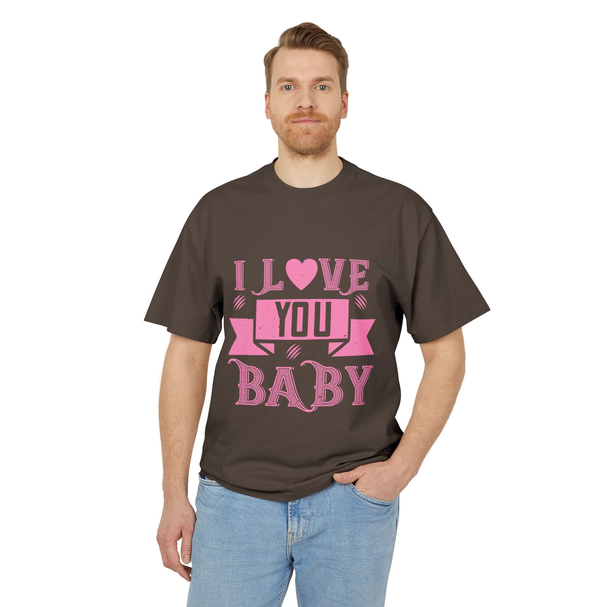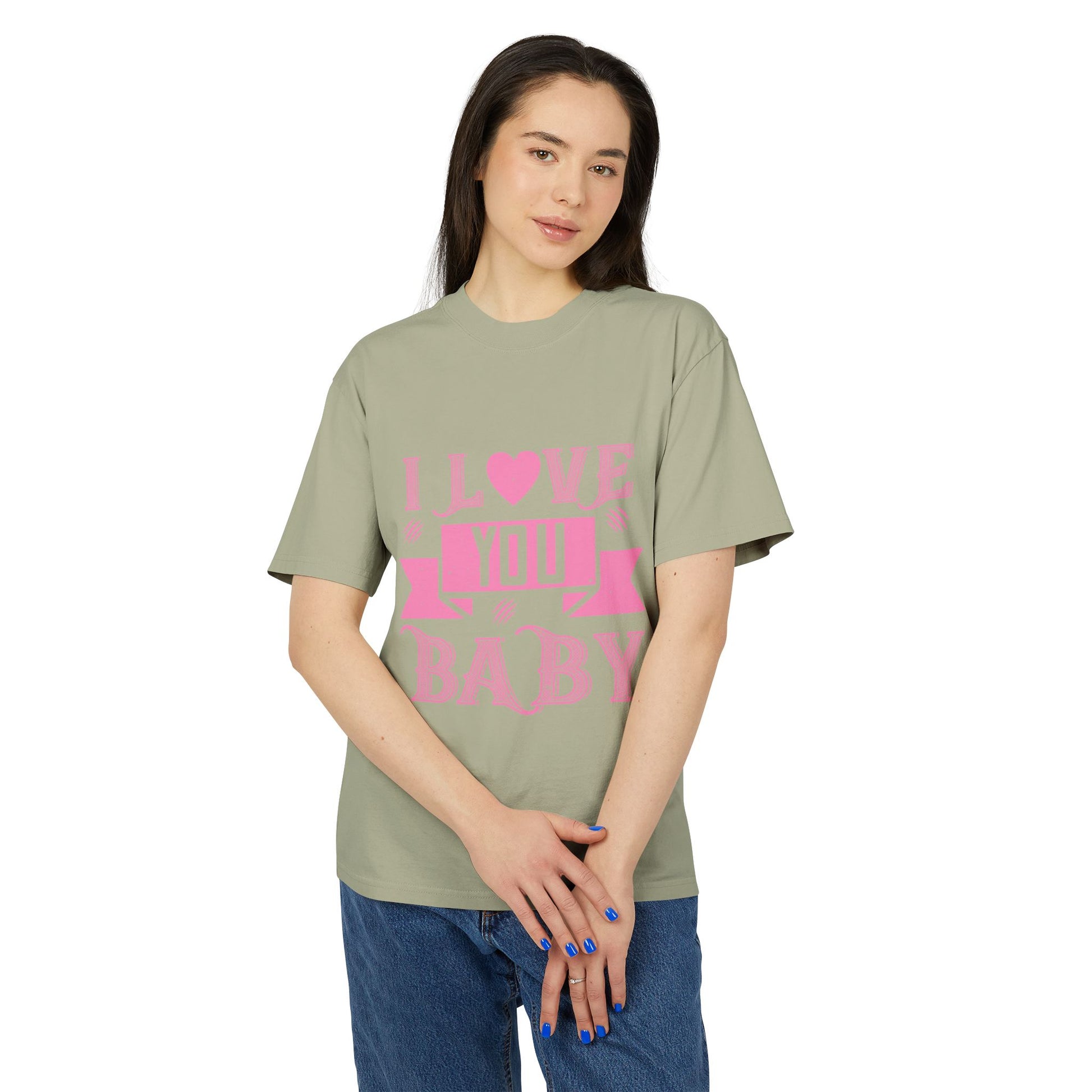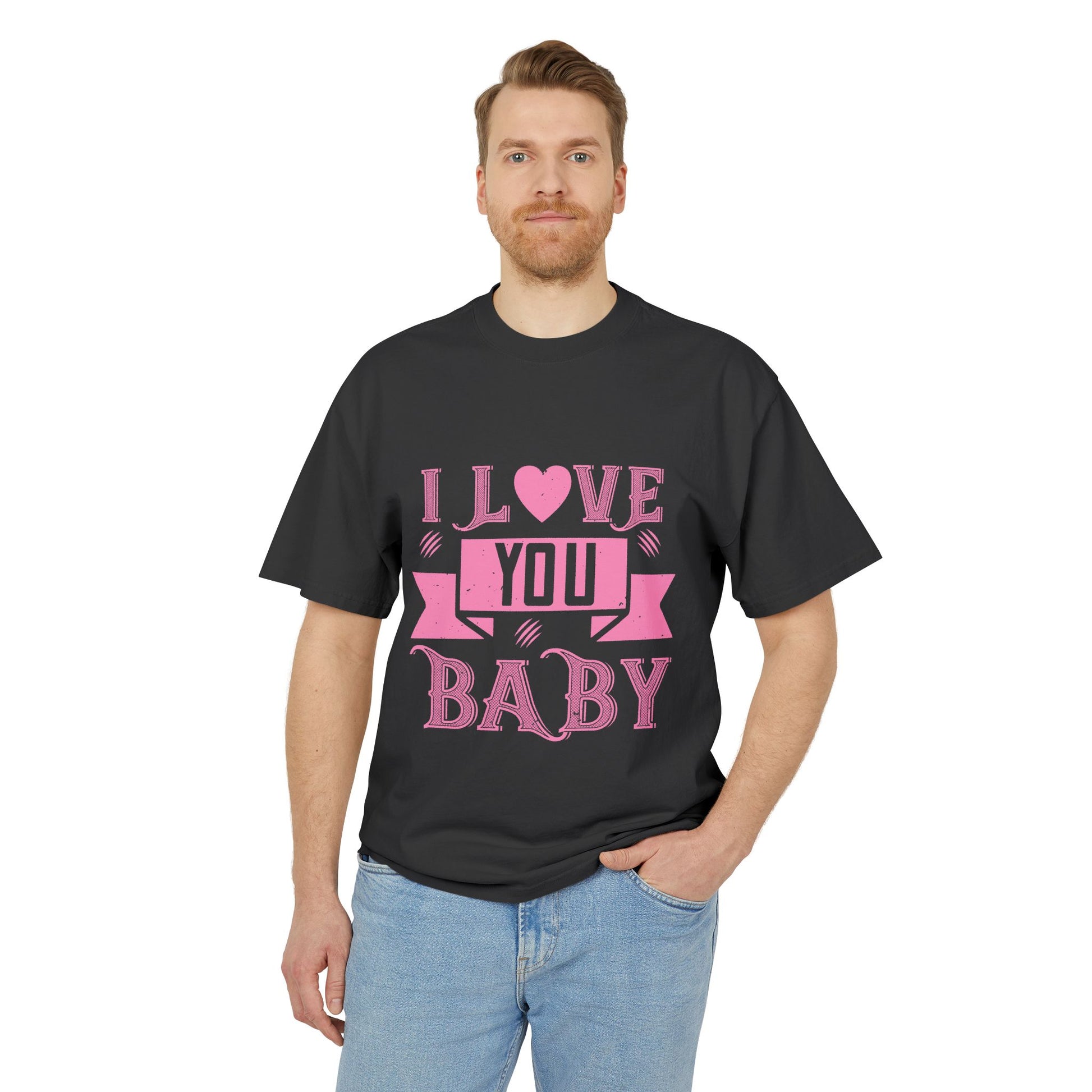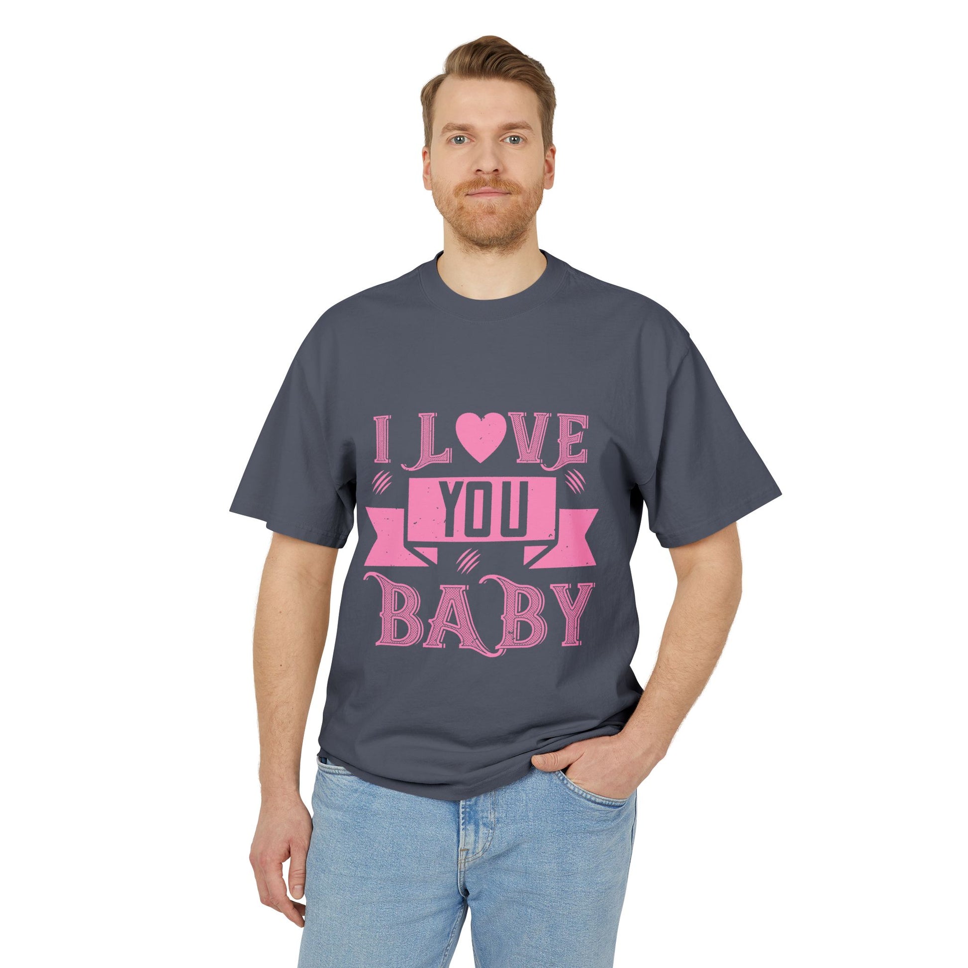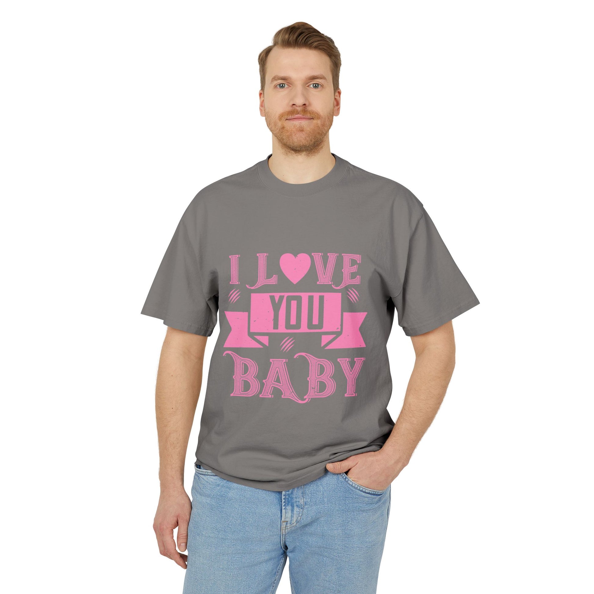 Soft, worn-in charm with a bold, affectionate voice. This heavyweight boxy tee carries a faded, vintage-style graphic that reads “I LOVE YOU BABY” in playful pink lettering—like a love note folded into your everyday wardrobe. The dropped shoulders and oversized cut let the fabric hang casually, while the sturdy 100% carded cotton and double-needle stitching give the shirt a pleasantly substantial feel that only gets better with time. Subtle post-dye fading and gentle edge gradients add character, making each piece feel like a found favorite. Wear it to slow mornings, casual dates, or when you want to send a sweet, low-key message without saying a word.
