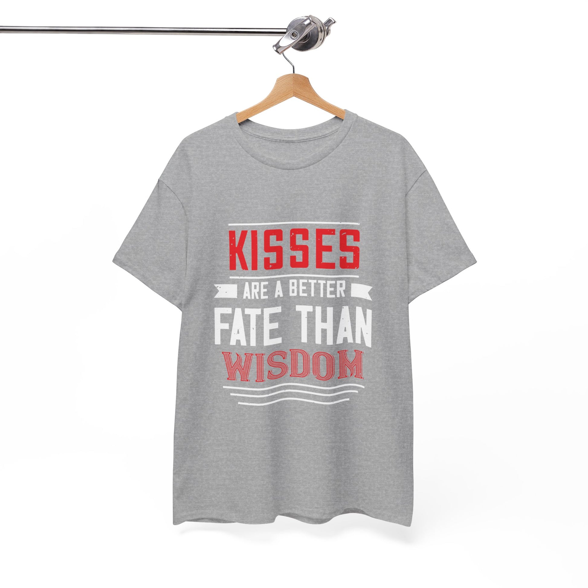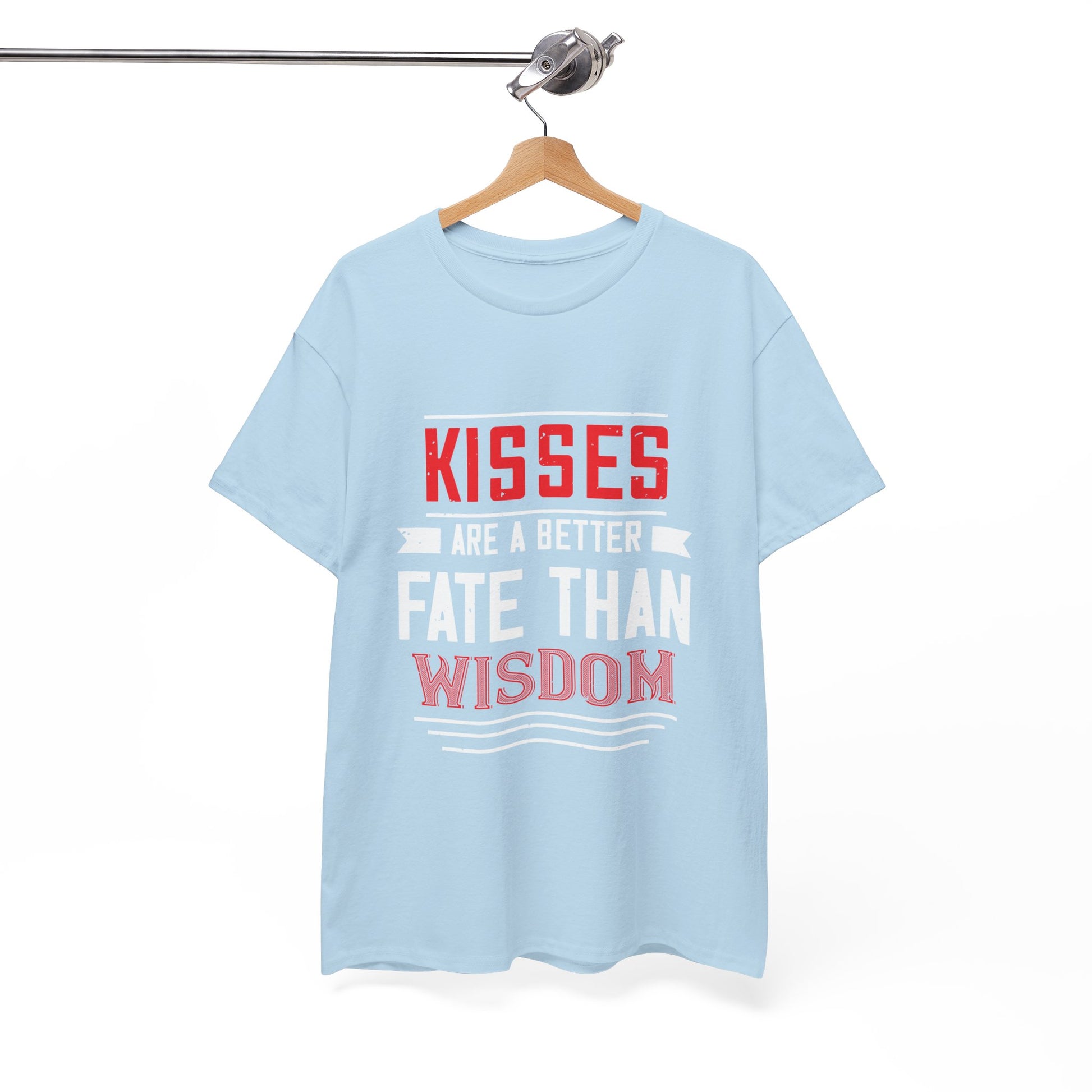 Soft, bold, and a little bit playful — this classic crew tee wears a cheeky slogan that reads “KISSES ARE A BETTER FATE THAN WISDOM.” The strong red and white lettering pops against the black fabric, giving the design a vintage poster vibe. It’s the kind of shirt that starts conversations and brings a grin: casual enough for everyday wear, dressable with a jacket for a night out. The medium-weight cotton holds print detail crisply and keeps its shape through repeated washes. Wear it when you want to lean into warmth, mischief, or nostalgia — whether you’re grabbing coffee, heading to a low-key show, or sharing a laugh on a date night.