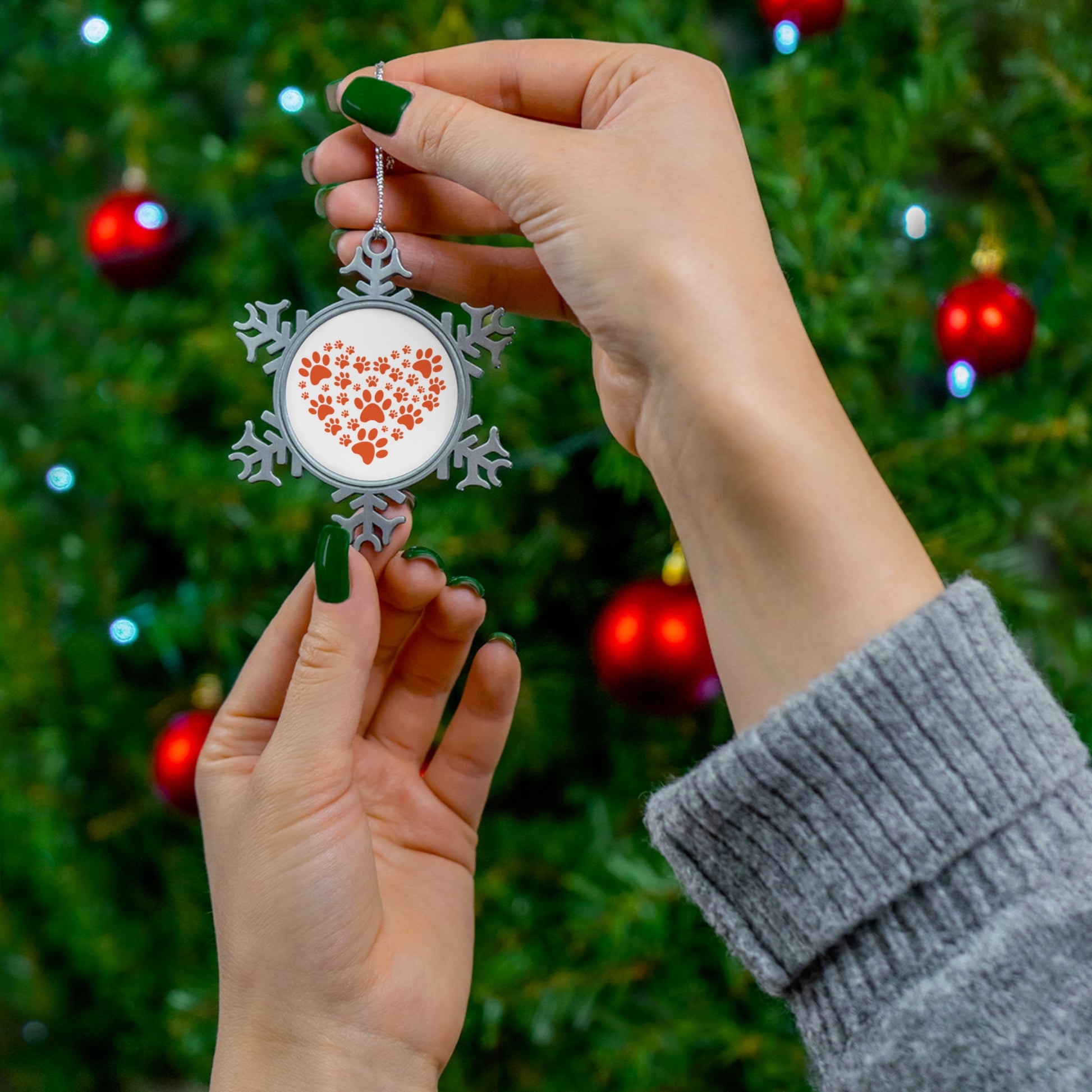 Pewter Snowflake Ornament — Red Paw Print Heart Holiday Keepsake