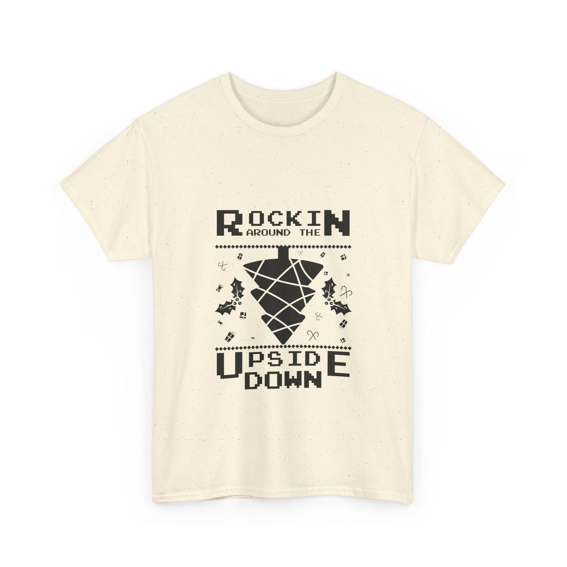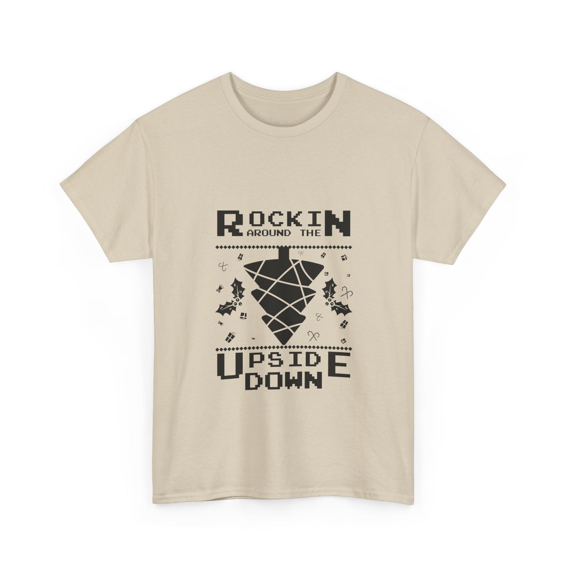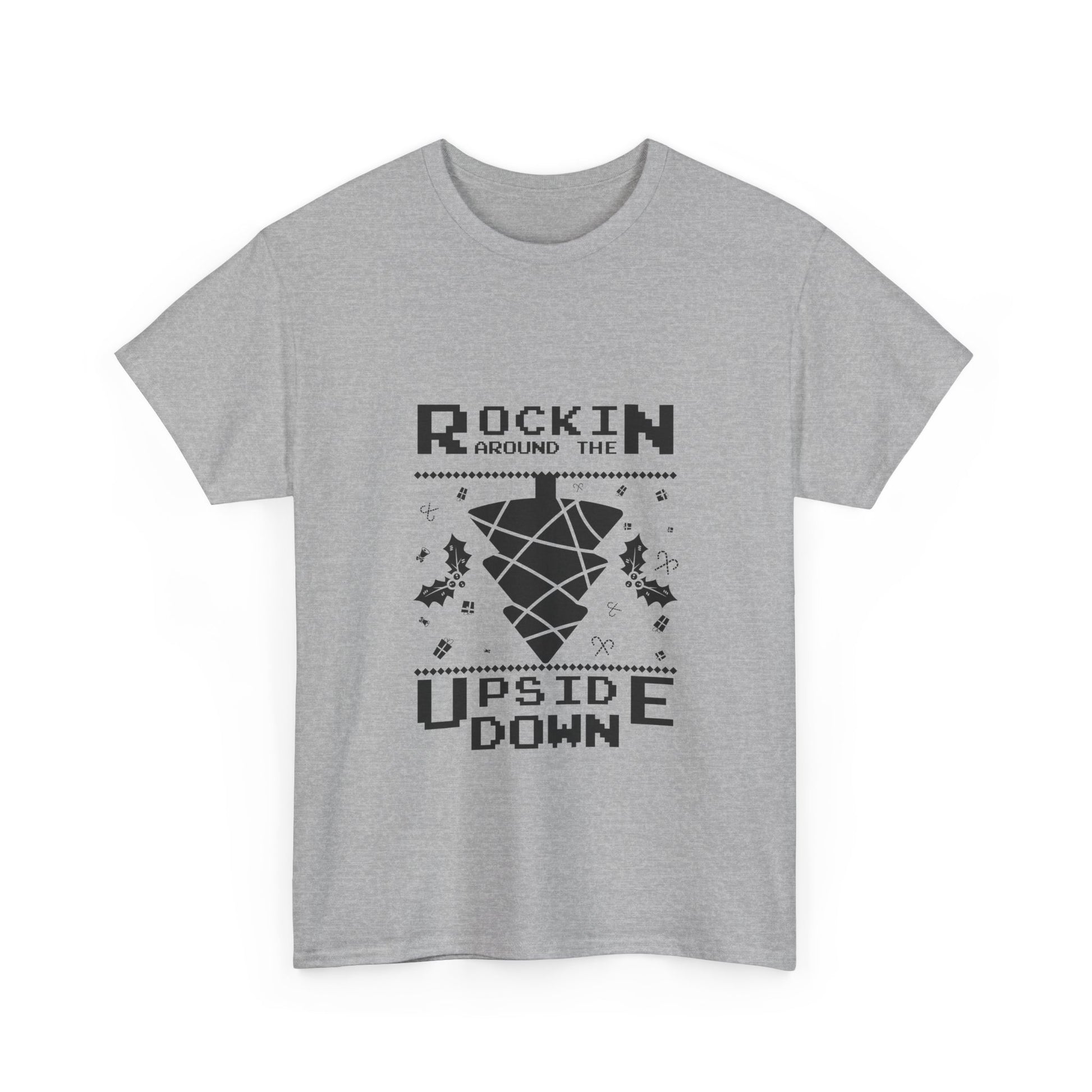This relaxed cotton tee carries a playful, nostalgic energy — a bold centered graphic flips expectations and invites a grin. The monochrome design reads “Rockin’ Around the Upside Down,” with fragmented geometric shapes and tiny decorative accents that hint at retro arcade and spooky-fun vibes. It wears like a lived-in favorite: breathable, durable, and soft against the skin. Throw it on for casual nights, fan gatherings, or whenever you want an understated statement that nods to cult-genre humor without shouting. The classic crew neckline and roomy fit make it easy to layer under jackets or pair with denim for an offhand, confident look.