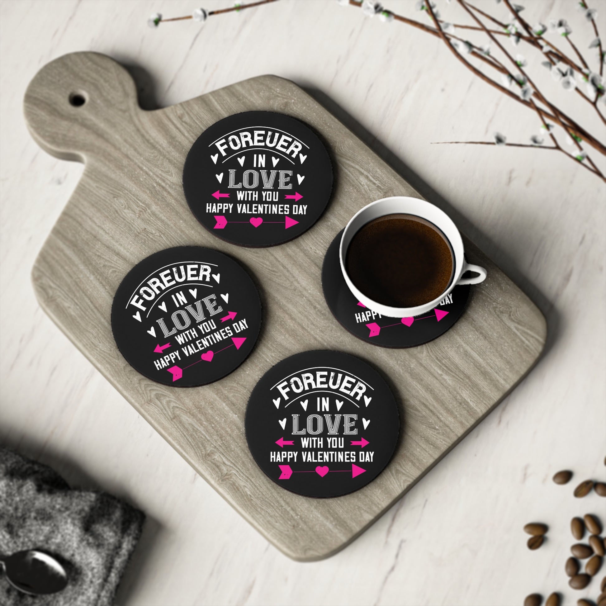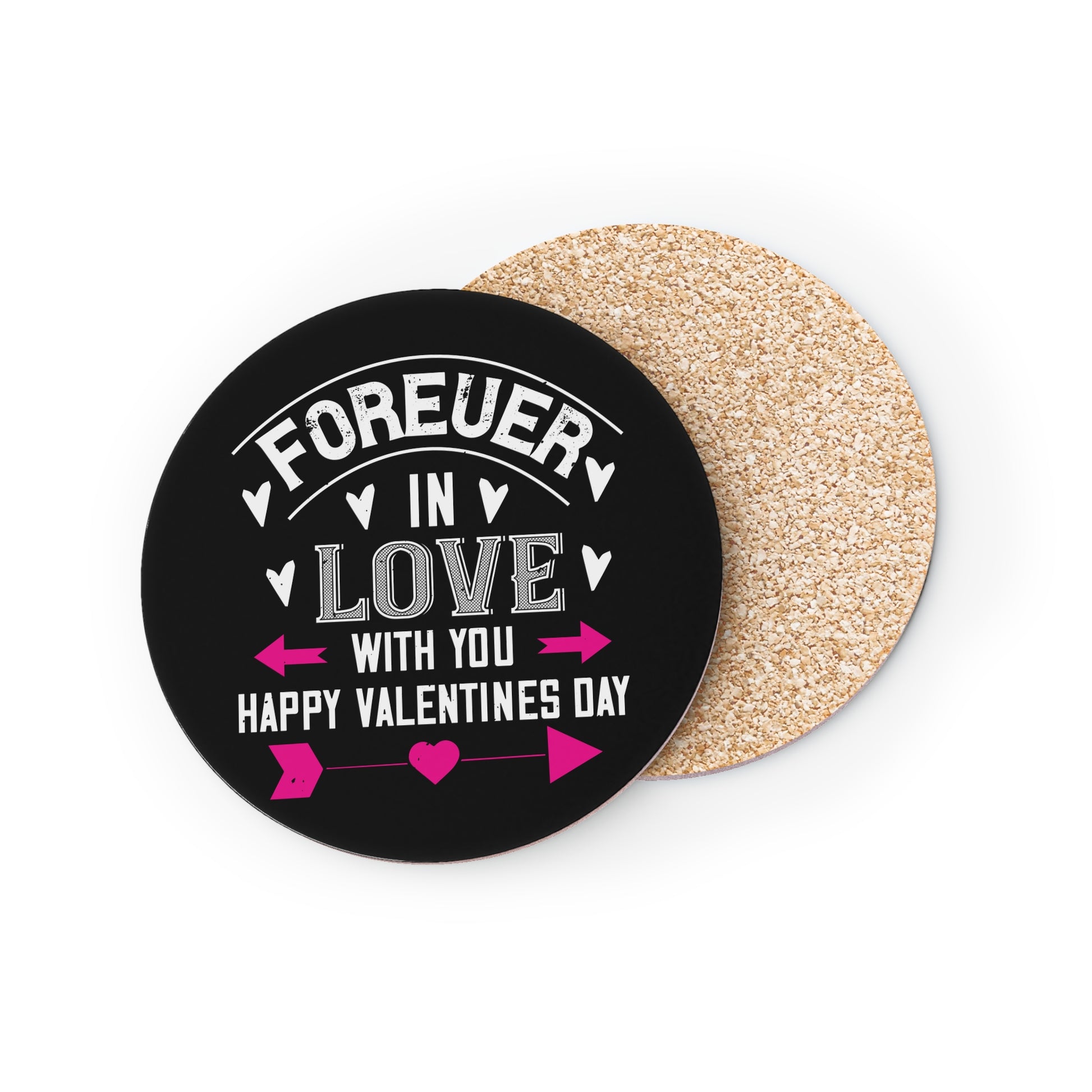 Small, heartfelt coasters that bring a splash of color and a touch of romance to coffee time. Printed with vivid inks on a glossy hardboard surface, each coaster shows a bold chalk-style love message with pink arrow accents against a deep black background. The corkwood backing keeps surfaces safe and prevents slipping while the smooth finish wipes clean after cups and mugs. Available singly or as a set of four, these compact coasters slide easily into a cozy vignette on a nightstand, side table, or breakfast tray — a little reminder of affection during quiet mornings and shared evenings.
