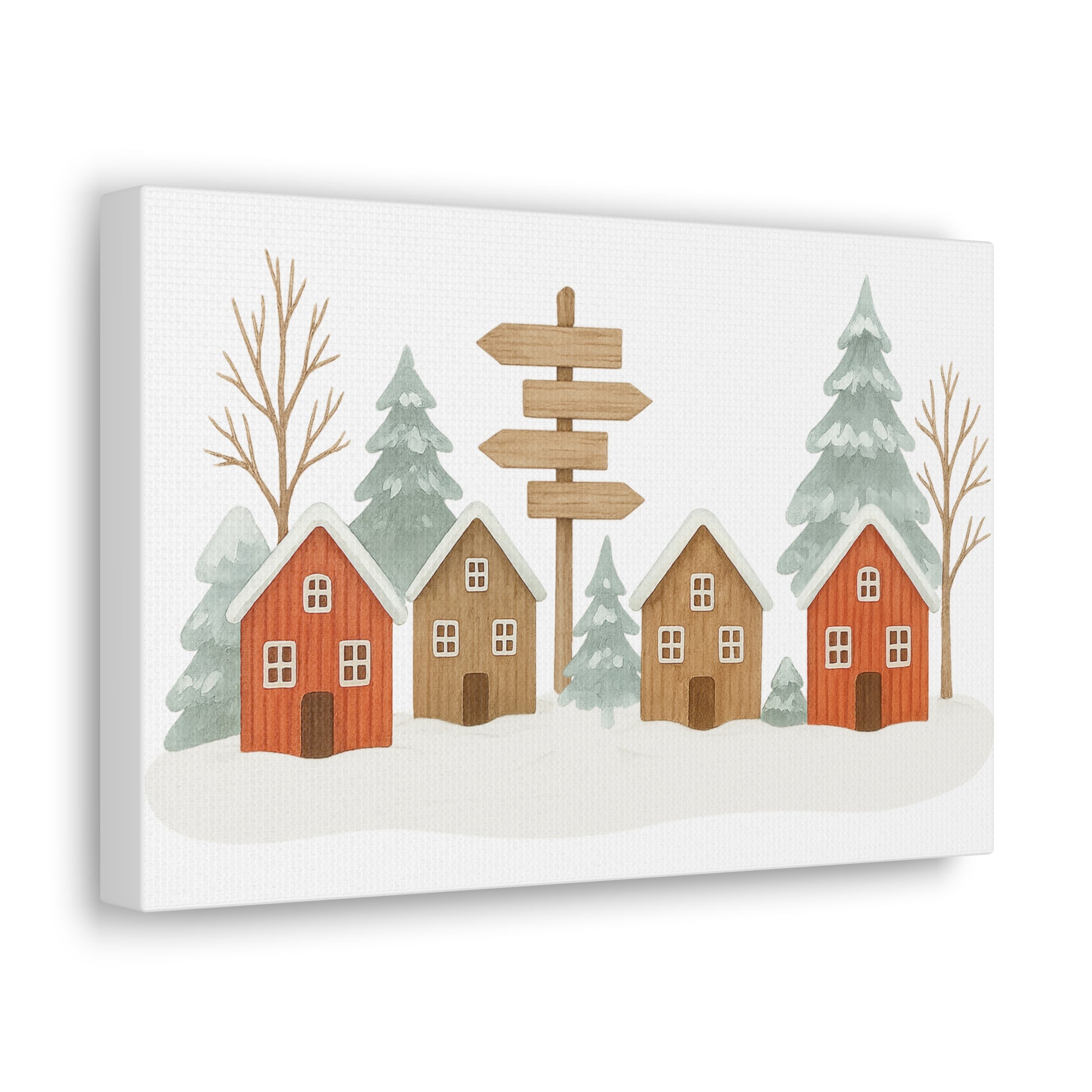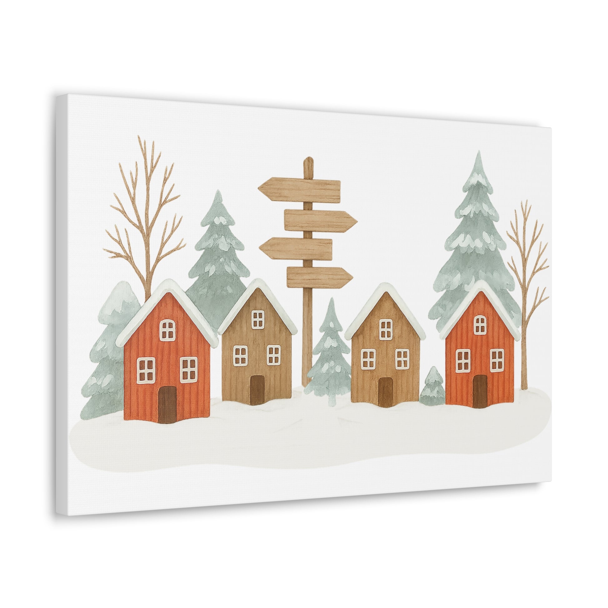 A warm, hand-painted winter scene printed on a satin-finish polycotton canvas. Soft greens, muted reds and warm pine browns bring a peaceful village moment to life — snow-dusted rooftops, tall evergreens, and a rustic signpost that points the eye. Hung on a New Zealand pinewood frame with a subtle semi-gloss sheen, this piece adds calm, cozy character to entryways, living rooms, nurseries or seasonal displays. It ships with a simple self-assembly hanging kit and multiple orientation and size choices so you can place it just where the scene feels right.